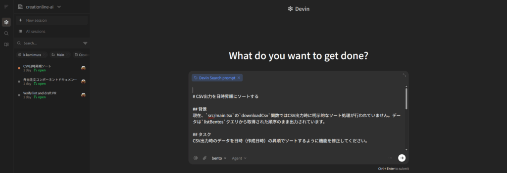 Ask Devinを経由せず、直接セッション画面で指示してセッションを開始することもできます。