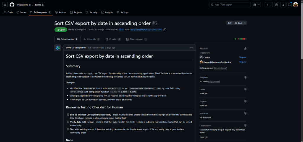 対応が完了するとDevinはGitHub上にPull Requestを作成します。