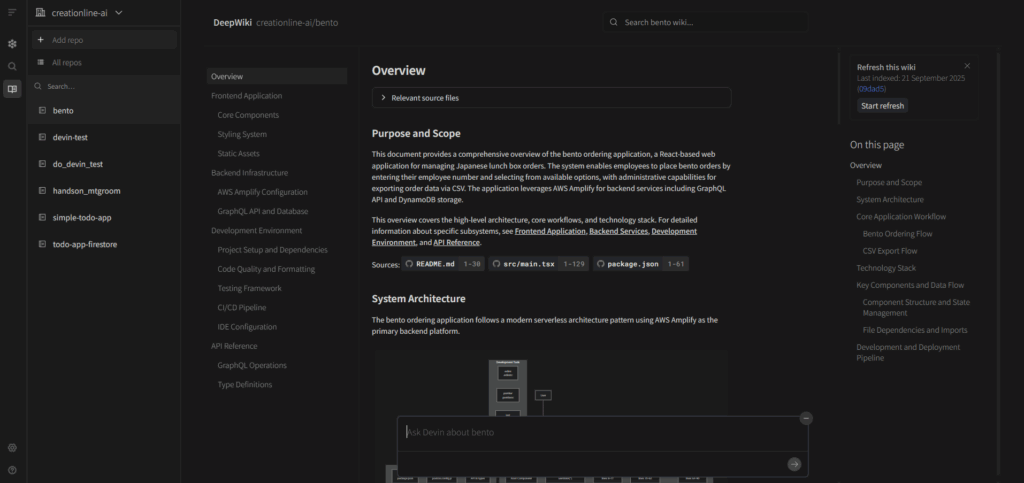 Devinでは1つのDevin’s machineで全てのリポジトリを扱います。セッション開始時に対象のリポジトリを複数指定できるので、例えばフロントエンドとバックエンドでリポジトリが別になっているような構成の場合に、1回のセッションで両方のリポジトリを調べながら両方まとめて改修することができます。逆に辛い点としては、複数リポジトリでNode.jsのバージョンが異なる場合などはNVMのようなツールで切り替えながら作業するように設定しておくことが求められます。このあたりも人間のチームメンバー用の開発環境と同じイメージです。