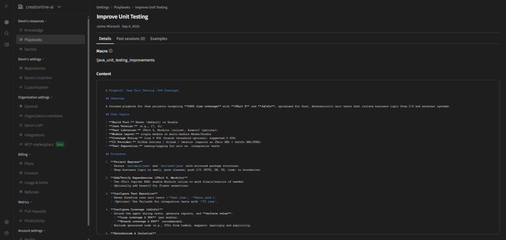 Playbookは自分で作ることもできますが、DevinではあらかじめいくつかのPlaybookが提供されています。例えば、標準で提供されているUnit Testing