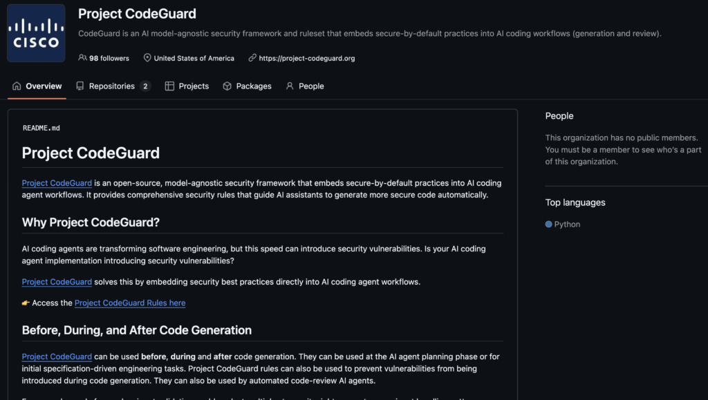 Project CodeGuardはCisco Systems, Inc.が始めた、利用するLLMに依存しないセキュリティに関するルールセットを整備していくオープンソースプロジェクトです。