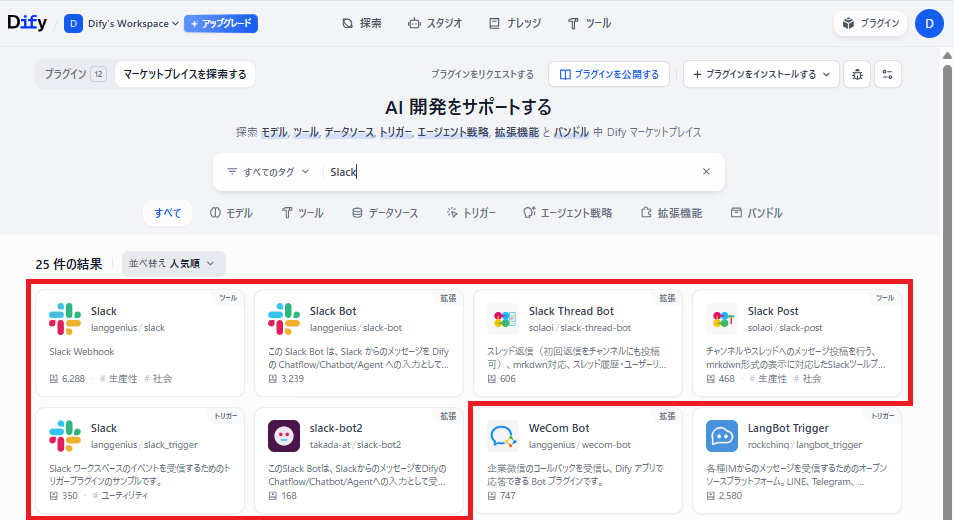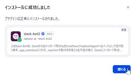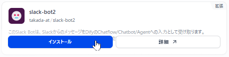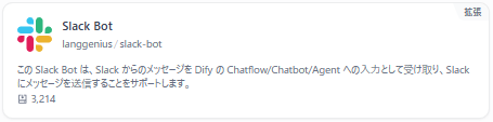 ※この記事を執筆している2026/1/21時点で、Slack Bot(langgenius/slack-bot) が公式マーケットからのインストールに失敗するようになっていました。どうも依存関係の矛盾があるようで、いずれ修正されるとは思いますが、前述のような理由もあるため、現時点で無理に使うことは無いと思います。