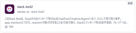 説明に「SlackからのメッセージをDifyのChatflow/Chatbot/Agentへの入力として受け取り」とある通り、SlackBotをメンションすることでチャットフローのトリガーとして利用できます。ただし、リアクションへの反応やスレッド返信ができず、次のslack-bot2(takada-at/slack-bot2)の方が上位機能版になるため、今回は詳細な説明は割愛したいと思います。