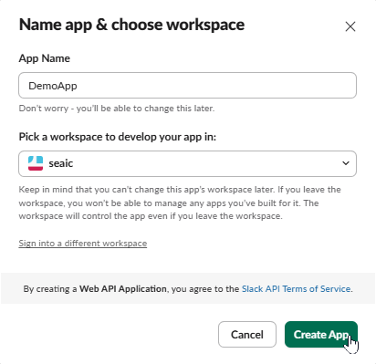 アプリ名を設定し、接続するSlackワークスペースを選択し、「Create App」をクリックします。