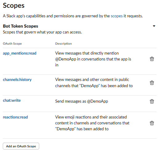 app_mentions:read- SlackBotがメンションされた際のメッセージ内容を読み取るchannels:history- SlackBotが参加しているパブリックチャンネルのメッセージを読み取るchat:write- SlackBotがメッセージを投稿するreactions:read- SlackBotがリアクション内容を読み取る