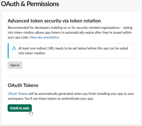 スコープの設定が完了したら、OAuth & Permissions > OAuth Tokens で、「Install to <ワークスペース名>」をクリックします。