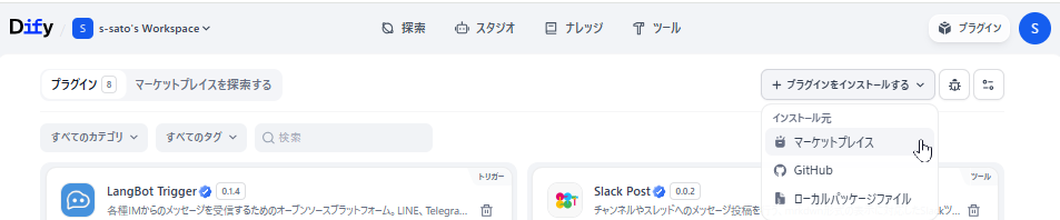 Difyでは公式やユーザーによって様々なプラグインが開発・提供されており、それらをマーケットからインストールすることができます。