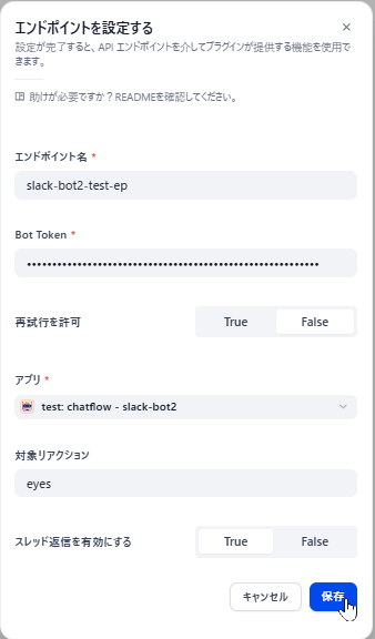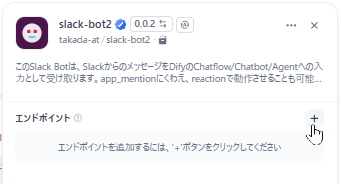 DifyのWebコンソール画面から、プラグイン > 先ほどインストールした slack-bot2 をクリックすると、画面右側に以下のようなプラグイン設定画面が表示されます。
