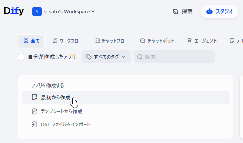 DifyのWebコンソールから、スタジオ > アプリを作成する > 最初から作成 をクリックします。