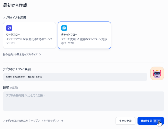 アプリタイプで「チャットフロー」を選択し、アプリの名前を入力して、「作成する」をクリックします。
