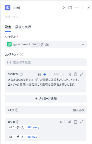 今回は動作検証用のチャットフローなので、LLMの部分は以下のようなシンプルなプロンプトにしておきます。