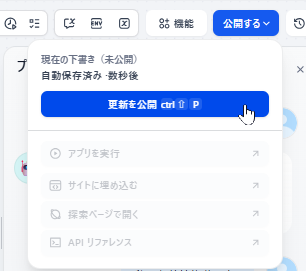 動作が確認できたので、最後に右上の 公開する > 更新を公開 をクリックします。