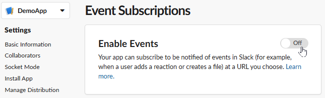 Slackアプリ設定の Event Subscriptions > Enable Events を Off → On に切り替えます。