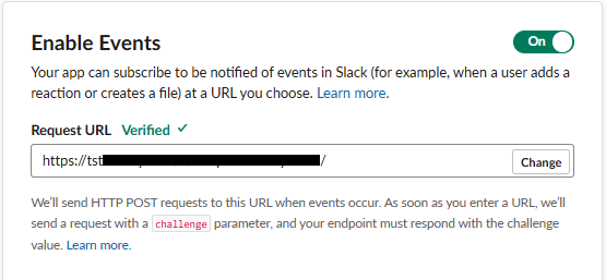 Slackアプリ側で、Slackで発生したイベントを、先ほど生成したURLにPOSTする設定が必要になります。