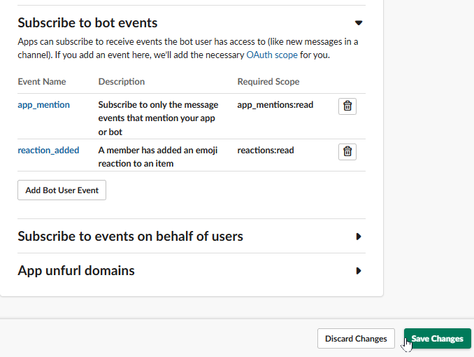 さらに、Event Subscriptions > Subscribe to bot events に以下のイベントを追加します。