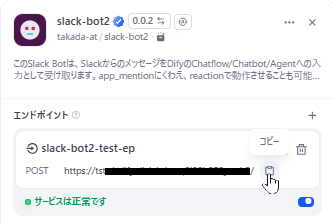 先ほど作成したチャットフロー用のエンドポイントが追加されましたので、今度はここで生成されたエンドポイントのURLをコピーして控えておいてください。
