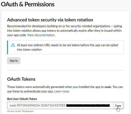 Slackワークスペースへアプリを追加すると、OAuth & Permissions > OAuth Tokens に Bot User OAuth Token が生成されます。このトークンは後ほど利用するため、コピーして控えておいてください。