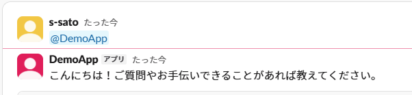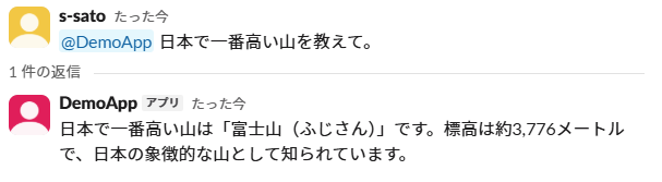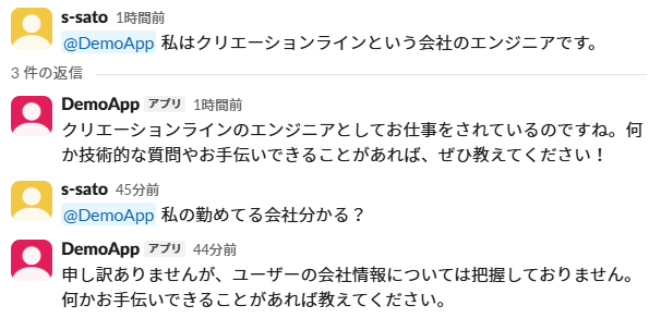 前者のslack-bot2のようにリアクションに反応することはできませんが、スレッドでの会話履歴を引き継げるという大きな特徴があります。