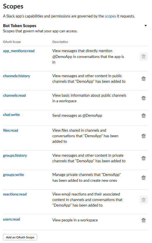 • app_mentions:read - Slackアプリがメンションされた際のメッセージ内容を読み取る