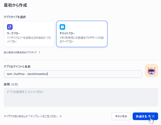 アプリタイプで「チャットフロー」を選択し、アプリの名前を入力して、「作成する」をクリックします。