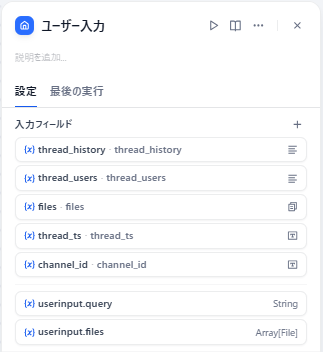 Slack Thread Botプラグインも、ここで追加した入力変数とチャットフロー標準の出力仕様に合わせて構成済みのため、最初のユーザー入力ノードと最後の回答ノードは、これ以外は特に設定をいじる必要はありません。