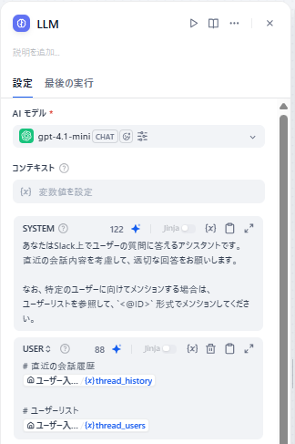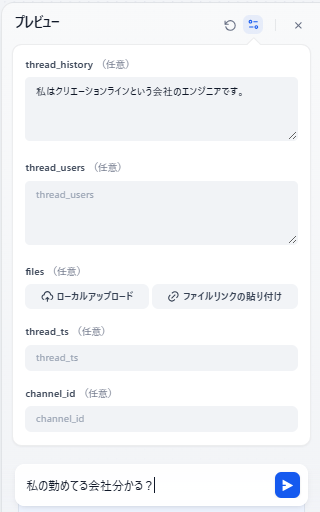 入力変数 thread_history がスレッドの会話履歴となるので、まずここにコンテキストとなる内容を入れておき、その上でそれに関連する質問をしてみたところ無事動作しました。