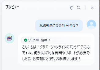 チャットフローが思った通りに動作するかを確認するため、画面上部の「プレビュー」をクリックします。