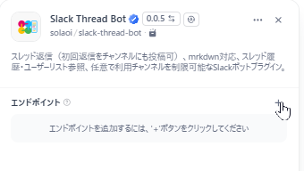 DifyのWebコンソール画面から、プラグイン > 先ほどインストールした Slack Thread Bot をクリックすると、画面右側に以下のようなプラグイン設定画面が表示されますので、エンドポイントの右側にある[+]ボタンをクリックして、エンドポイントを追加します。