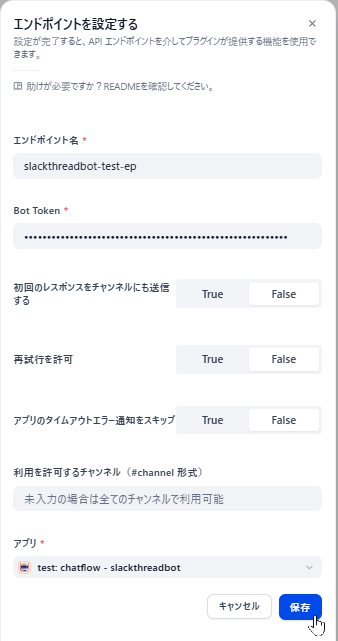 • アプリ: 先ほど作成したチャットフローを指定