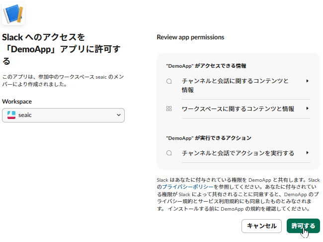 Slackワークスペースへのアクセス許可が求められるため、「許可する」をクリックします。
