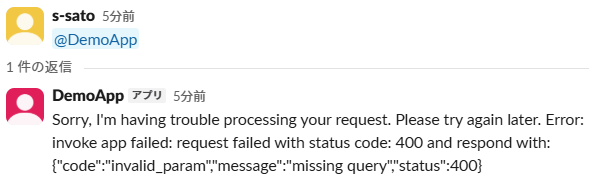 メンションしたため早速スレッドで返信がありましたが、slack-bot2と違いエラーが返ってきました。
