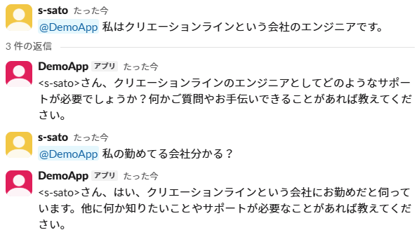 Slack Thread Botの特徴である会話履歴の引き継ぎを試してみたところ、きちんと引き継がれていました。