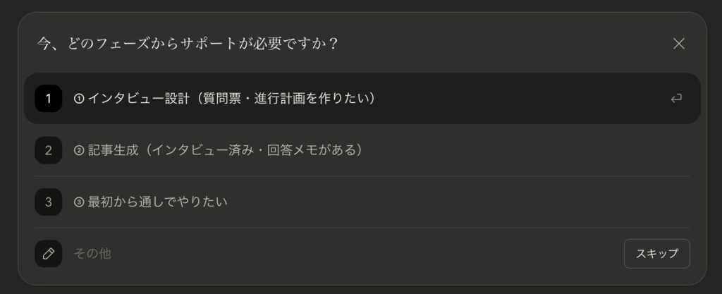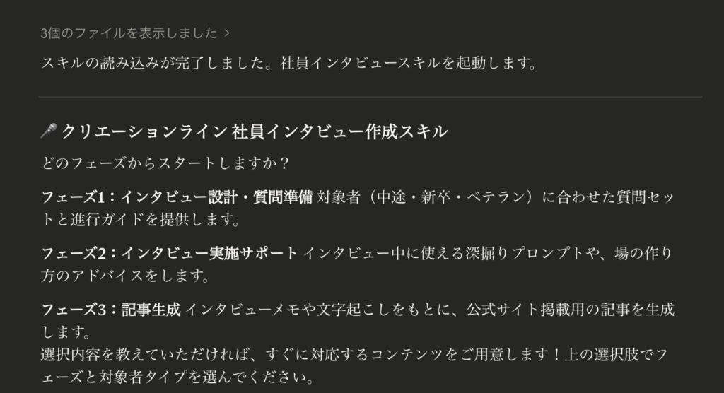 1. 作成したSkillsを /employee-interview と入力して呼び出すと、インタビュー記事作成モードが起動します。「フェーズ1:インタビュー設計」「フェーズ2:実施サポート」「フェーズ3:記事生成」と段階が出てくるので、必要なフェーズを選んで進んでいくだけです。
