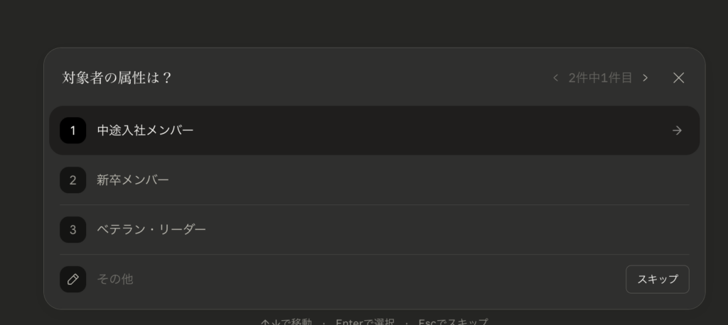 対象者として「ベテラン・リーダー」を選んだのですが、もともと私はこのSkillsを「中途採用者や新卒向け」として想定していました。ところが選択肢に「ベテラン・リーダー」も入っていて感心しました。しかも出てきた質問が、「辞めようと思ったことはありますか?」「CLで長く働き続けている理由を正直に話してもらえますか?」など、かなり核心を突くもので、「コンテンツとして興味を持ちそうなものを理解して設計しているな」と感じました。