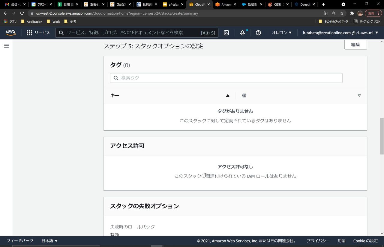 設定値の確認画面に行くので、設定内容に誤りがないか確認し、一番下の、「AWS CloudFormationによってIAMリソースがカスタム名で作成される場合があることを承認します。」にチェックを入れ、「スタックの作成」をクリックします。