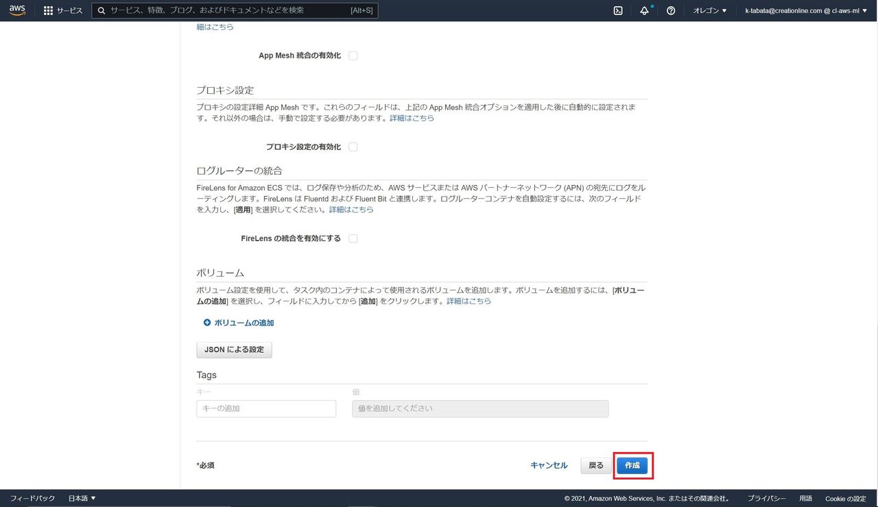 「新しいタスク定義の作成」の画面に戻り、画面下部の「作成」をクリックすると、タスク定義が完成されます。