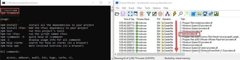 上図では、npm コマンドを実行した後、node.exe は providers.dll という DLL を検索しています。