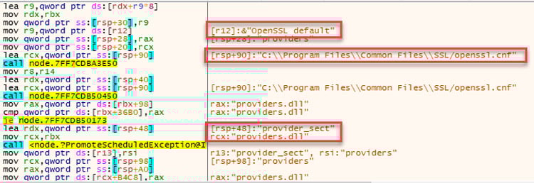 次に、node.exe のフローを詳しく見てみました。プログラムは openssl.conf ファイルを読み込み、provider_sect に定義されている値を探します。この場合、この値は providers なので、デフォルトで providers.dll というファイルを探します。