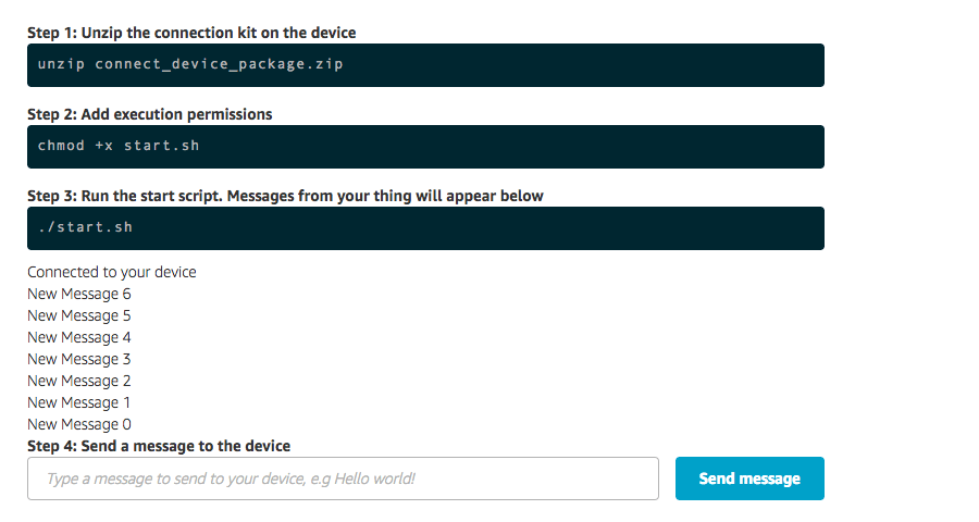 「Step 4: Send a message to the device」の下の入力欄に「Hello」とメッセージを入れて「Send message」ボタンを押してみました。どうでしょうか?
