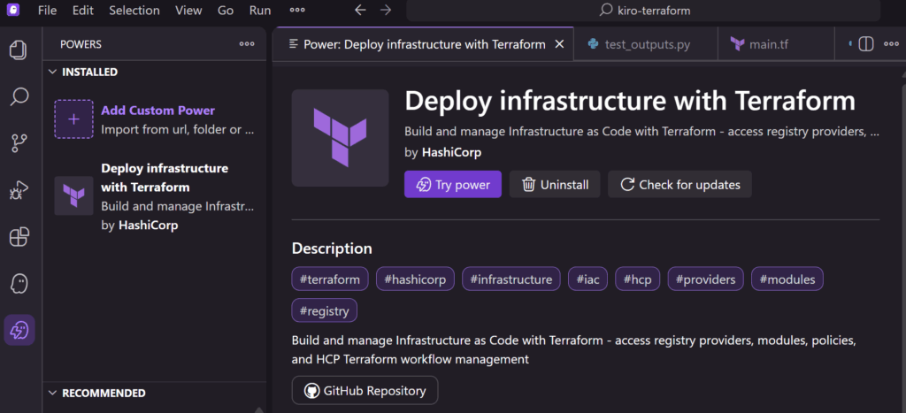 Kiro の拡張機能である Kiro powersの中から、HashiCorp Terraform powerを使用しました。