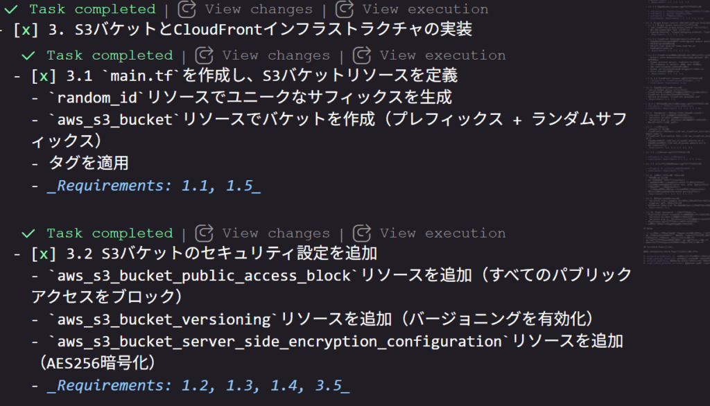 各タスクを実行するたびに、Kiro は該当する Terraform コードと併せて、その要件を検証するための テストスクリプト も同時に生成してくれます。