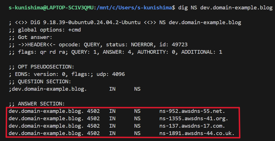 dev.domain-example.blogのDNS問い合わせはRoute53へ問い合わせてください