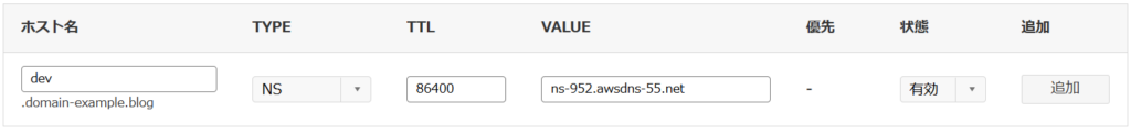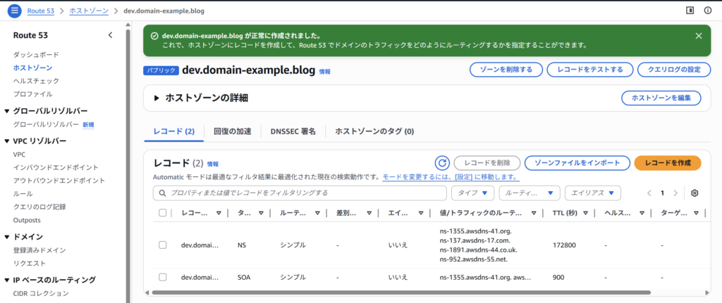これにより、サブドメインである dev.domain-example.blog のDNSレコードを
