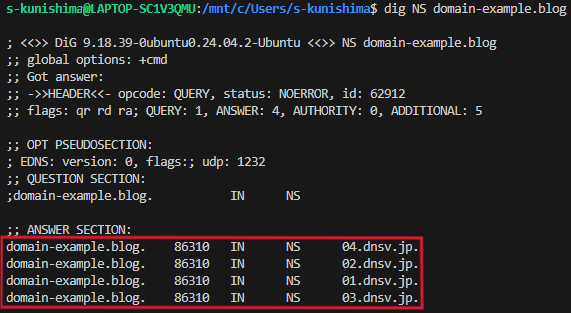 その後、dev.domain-example.blog に対する問い合わせは、NSレコードによって