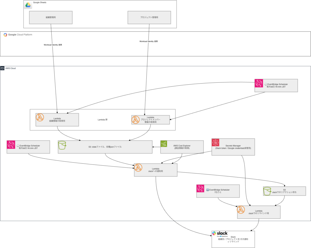 - データの連携: Google CloudのWorkload Identity連携を利用し、スプレッドシートの情報をAWS Lambdaへ出力します。