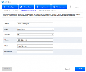 続いて、[PRIMARY STORAGE] の設定を行います。以下のように各フィールドの値を指定し、[Next] をクリックします。