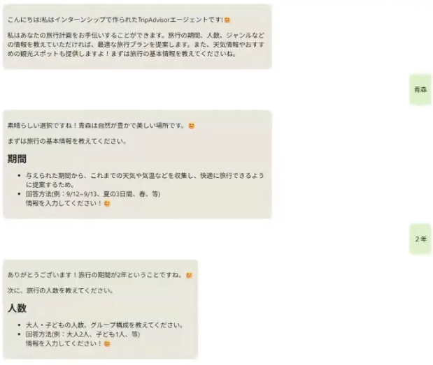 最終日は、Day4で作成した旅程提案エージェントの発表会でした。僕たちのチームは、チャットベースということもあり、AIが質問してくる内容に気軽に答えることで最終的にはその方にあった旅程を提案するアプリに仕上げました!