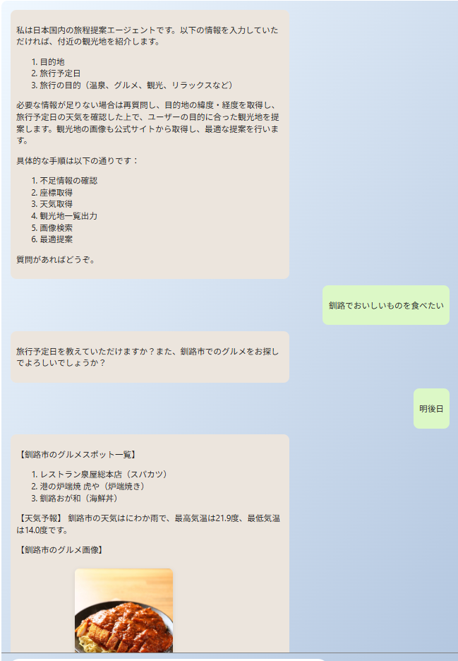 また、基本的なチャット機能から、おすすめの観光地とともに画像を表示するという機能を追加しました。一つの観光地につき一枚の画像を表示することで、より観光地へのイメージが広がり、ユーザーが観光地を決める手助けになると考えました。