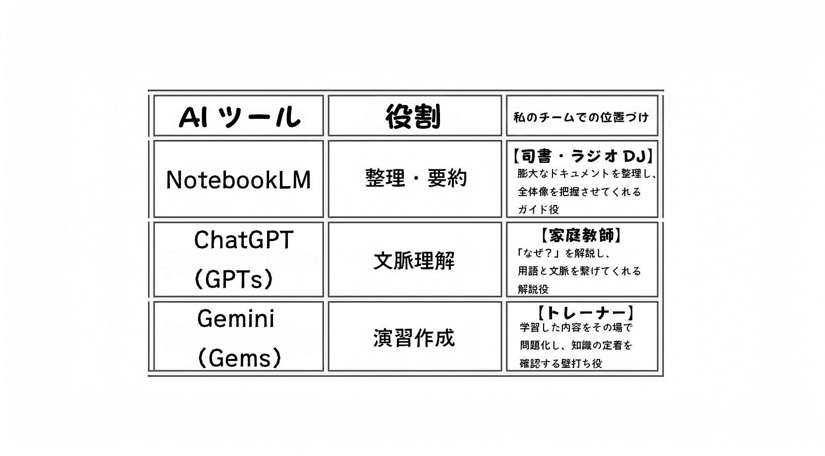 従来の勉強法が「一人で黙々と教科書を読む」ものだとしたら、今回の方法は「3人のAIメンターと対話しながら進める」イメージです。 それぞれのツールには、私の苦手をカバーするために以下の役割を持たせました。