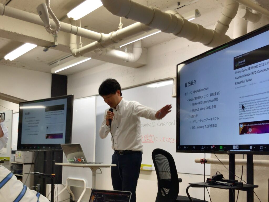 三人目は、kazuhitoyokoiさん (@kazuhitoyokoi)。Node-REDはオープンソースのフローベースのビジュアルプログラミングツールです。産業向けIoT分野で特に広く使用されているそうです。kazuhitoyokoiさんはNode-REDの開発メンバーでユーザグループ運営メンバーでもあります。Node-REDのGit連携機能を使えばGitLabでフローを共有でき、Gitに詳しくない工場のエンジニアの方も使いこなしているそうです。